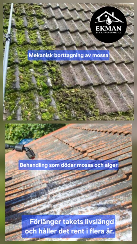 Mossa och påväxt binder fukt, vilket kan skada pannor och förkorta takets livslängd. Genom att behandla taket i tid minskar du risken för framtida skador och kostsamma takbyten.